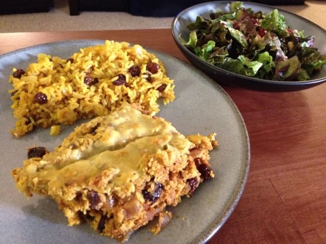 She suggested pairing it with this baked brown rice, seasoned with cinnamon and sugar and turmeric, mixed with raisins and onion and garlic. It was GOOD.