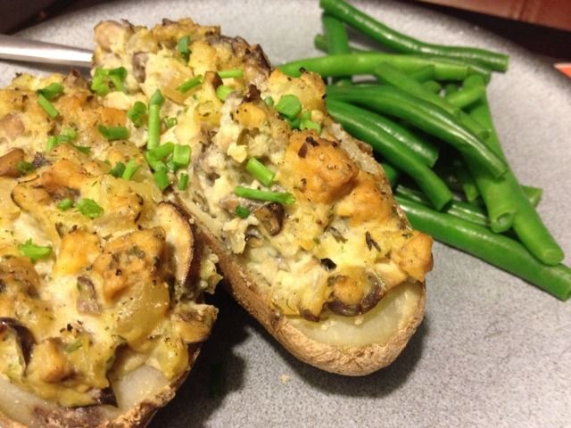OK so the filling is a stroganoff recipe from American Vegan Kitchen: baked tempeh cubes and mushrooms in a (homemade) tofu-chive sour cream sauce. Then you hollow out the potatoes and add the mashed filling to the tempeh mixture, mix it all together, and stuff the potatoes. It was delicious! I have tons of extra filling to eat plain for breakfast tomorrow.